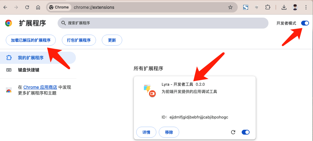 ➔ 在浏览器中打开 - chrome://extensions ➔ 将 zip 直接拖向页面 ( 如有问题尝试下面的操作 ) ➔ 在右上角检查 - 开发者模式 是否启用 ➔ 在左上角点击 - 加载已解压的拓展程序 ➔ 下载拓展并解压,然后选择解压后的目录